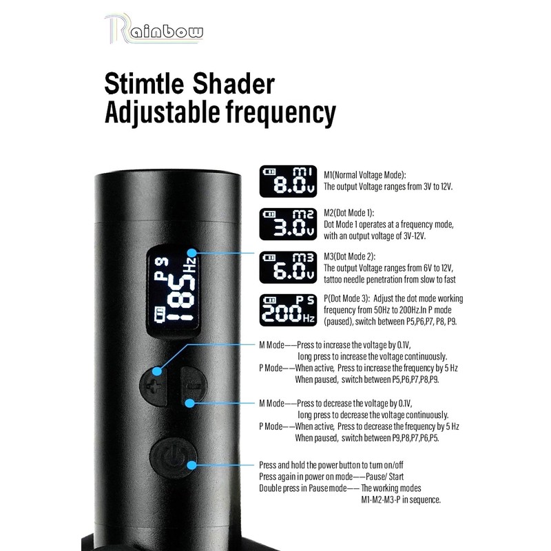 • P Mode (Dot Mode 3): In pause mode, switch between P5 (5V), P6 (6V), P7 (7V), P8 (8V), P9 (9V) using plus/minus buttons. When active, adjust frequency from 50Hz to 200Hz in 5Hz increments with plus button.