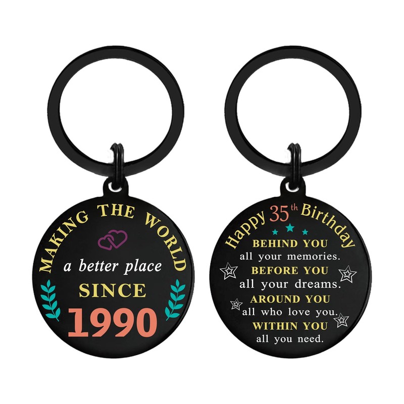 - Born in 1990 Birthday Keychain - the front side is "Making the world a better place since 1990", the back side is "Happy 35th birthday! Behind you, all your memories. Before you, all your dreams. Around you, all who love you. Within you, all you need."