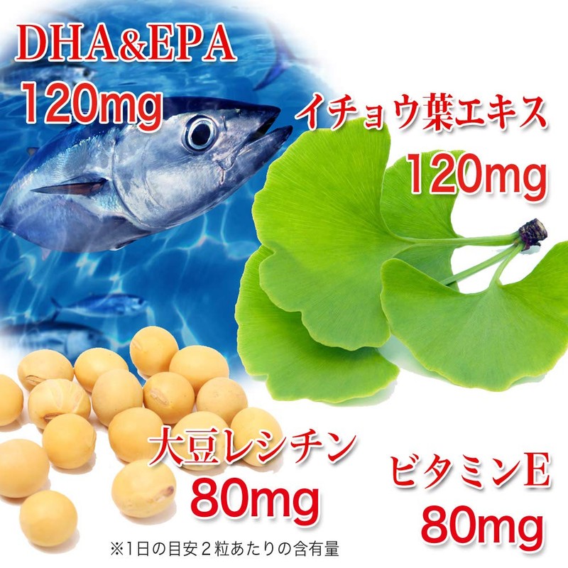 - ✅【主要成分-2粒あたり】イチョウ葉エキス 120mg、精製魚油(DHA.EPA含有)120mg、大豆レシチン80mg、ビタミンE80mg ✅ 飲み方:1日2粒を目安に、水でかまずにお召し上がりください。