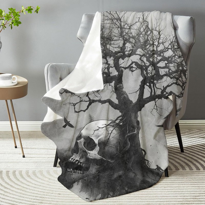 - [Funny Skull Theme Print] Our skull blanket features a hauntingly beautiful design of a skull entwined with the roots of a gnarled tree, set against a moody, monochromatic backdrop. The intricate details and eerie atmosphere evoke a sense of mystery and gothic charm, making it perfect for those who appreciate dark, sophisticated art.