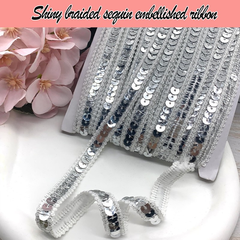 - EASY TO USE Shiny sequins are securely sewn with the ribbon. You can attach it to the desired clothes or crafts with a hot glue gun or needle and thread, easy and convenient operation. With a length of 25 metres and a width of 12 mm, you can easily cut the sequin lace strip as needed to meet the size requirements of different projects
