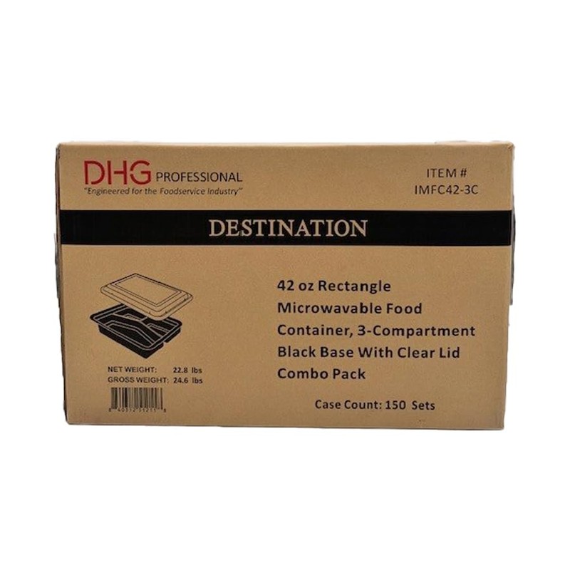 DHG PROFESSIONAL 42oz Food Prep Containers with 3-compartment Black Base & Clear Lids - Rectangular - Microwavable Disposable Freezer-Safe BPA-Free Plastic Meal Storage, Combo Pack of 150 sets