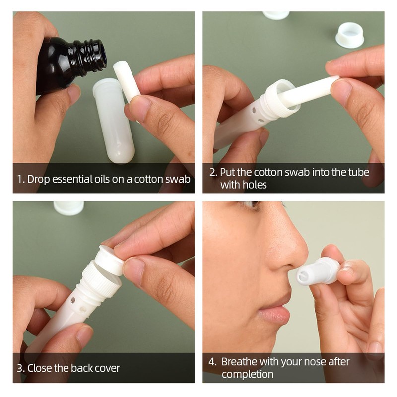 STRONG SEALING Each inhaler consists of three parts: inhaler, cotton wick and cap. They seal tightly and thus extend the duration of the fragrance and fragrance. So you don't have to worry about essential oils leaking out and contaminating the bag.