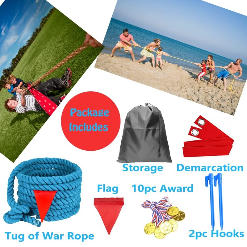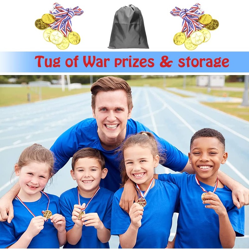 - 【Easy to Use】 It is easy for you to use the tug-of-war rope, first wrap the pennant around the centre of the rope, then hook the red marker line to the ground, finally you will have fun in tug-of-war; with 10 gold medals,Have a good time play with tug of war games and pulling your team to victory and win an award medal. Besides, we provide you with a black bundle bag to store all the accessories for easy storage.