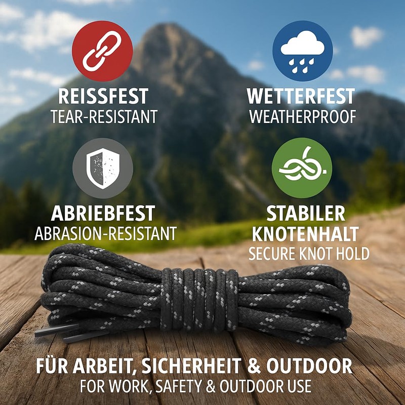 - Suitable for mountain boots, work boots, motorcycle boots low - secure hold at work, outdoors, leisure or sports; shoelaces in neutral black-grey (black-grey).