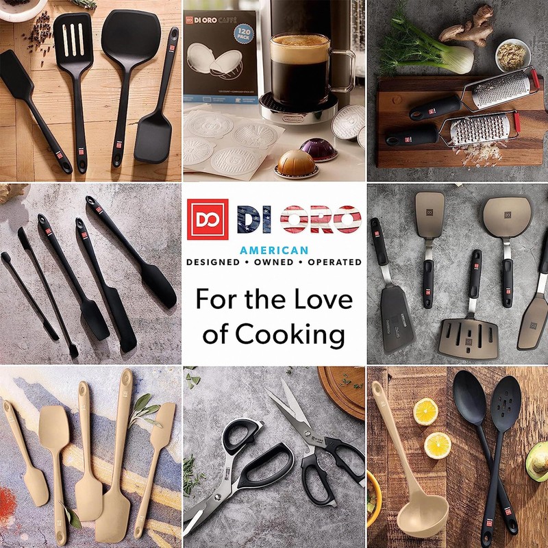- Diseño pensado y creativo: mide una longitud de 12.5 pulgadas, construido con un núcleo de acero inoxidable fuerte y duradero, y diseñado con una capacidad óptima del tazón, la cuchara de silicona DI ORO está diseñada para manejar la agitación, servir y otras tareas en tu cocina con facilidad. Nuestro mango suave aterciopelado resistente al calor de 700 °F no se derrite y se ajusta como un guante en la palma de tu mano.