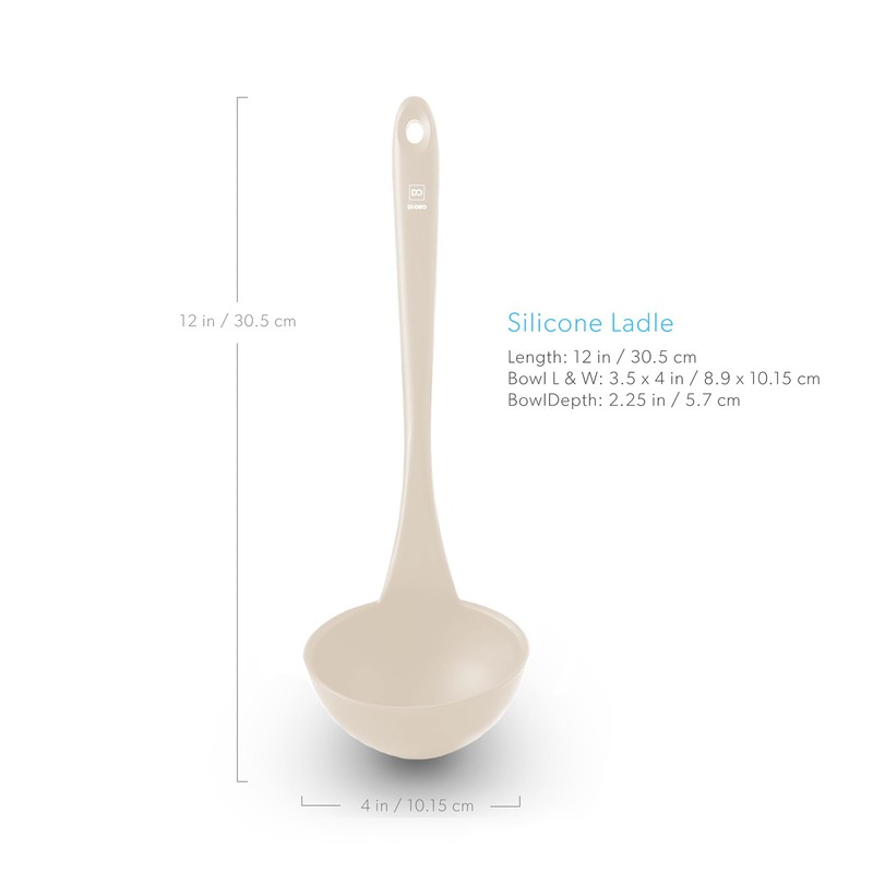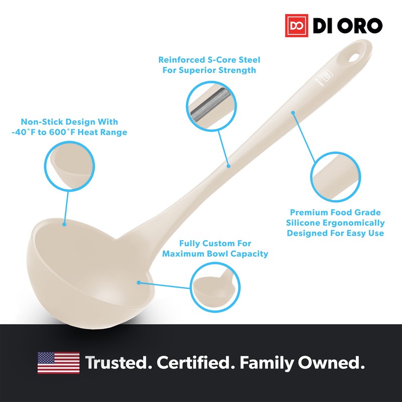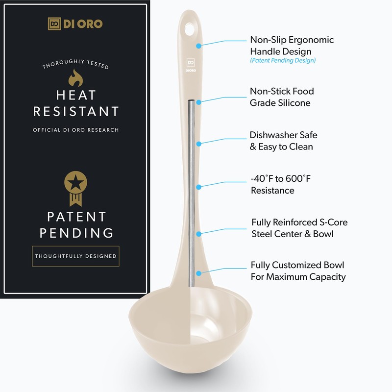 - Solo lo mejor: por demanda popular, hemos añadido un cucharón de silicona a nuestra galardonada línea de utensilios de cocina sin costuras. El cucharón Di Oro sin costuras de la serie está hecho con silicona de grado alimenticio, sin BPA y certificada LFGB. Diseñada para soportar el calor, esta herramienta de diseño ergonómico es resistente al calor hasta 700 °F, lo que significa que nunca derretirás tu utensilio de cocina favorito.