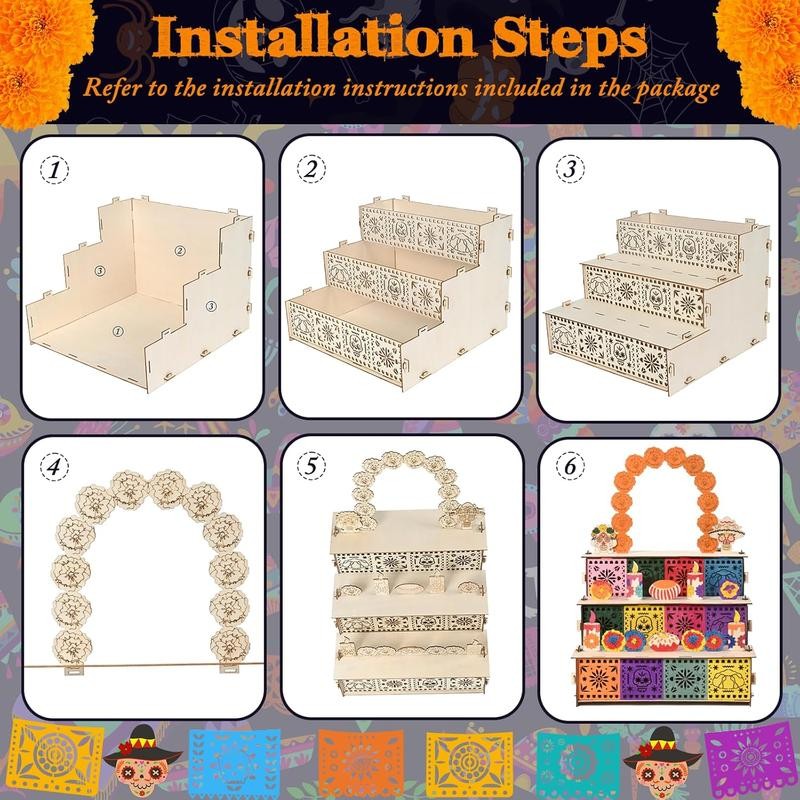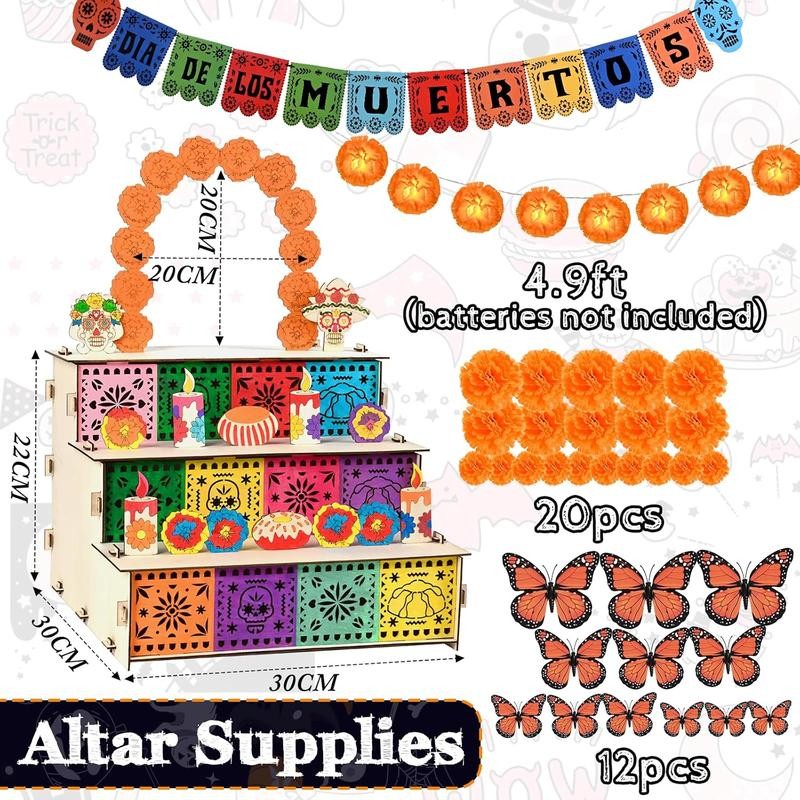 Dia De Los Muertos Altar Ofrenda, Wooden Day of The Altar with Photo Frame, Altar De Muertos, Ofrenda Decorations included Altar Supplies Colorful Banner Light 20 Marigold 12 Butterflies
