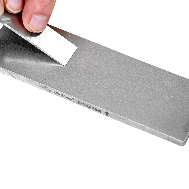 Expect cutting edge performance with DMT 's Dia-Sharp 6-Inch continuous diamond sharpening bench stone. For knives, blades and fine tools. Extra-Fine (9 micron / 1200 mesh) to polish and refine a razor edge after sharpening with a coarser diamond. Size: 6-Inch by 2-Inch by 1/4" Includes non-skid rubber feet. Diamond grade clearly marked on side of stone. Sharpening with diamonds is fast and easy. No messy oils needed--sharpen dry or with water. Durable construction will provide years of consistent performance and reliable service For proper tool maintenance, woodworkers, chefs and other professionals rely on the superior quality and versatility of DMT products. Made in USA.