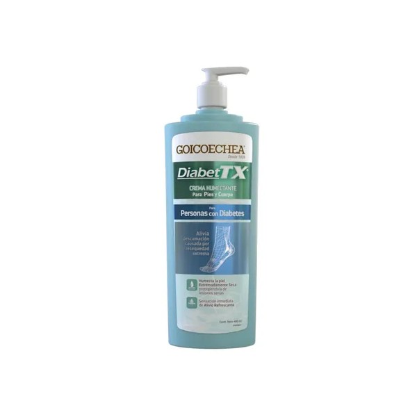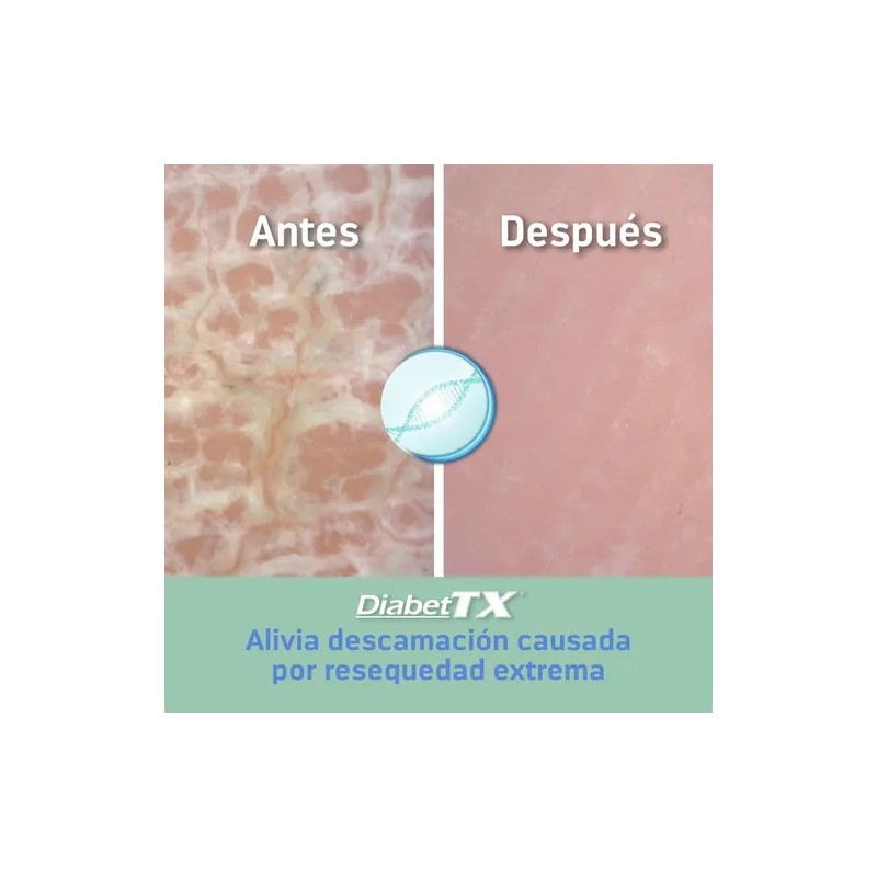 DiabetTX Crema HUMECTANTE e HIDRATANTE, crema corporal (pies y cuerpo) está diseñada especialmente para personas con diabetes y pieles EXTREMADAMENTE SECAS, que presentan AGRIETAMIENTO o DESCAMACIÓN. Su fórmula hidrata y humecta las zonas de piel extremadamente seca o con callosidad, protegiéndola de lesiones. DiabetTX Crema mejora la apariencia de la piel otorgándole una sensación inmediata de alivio refrescante.