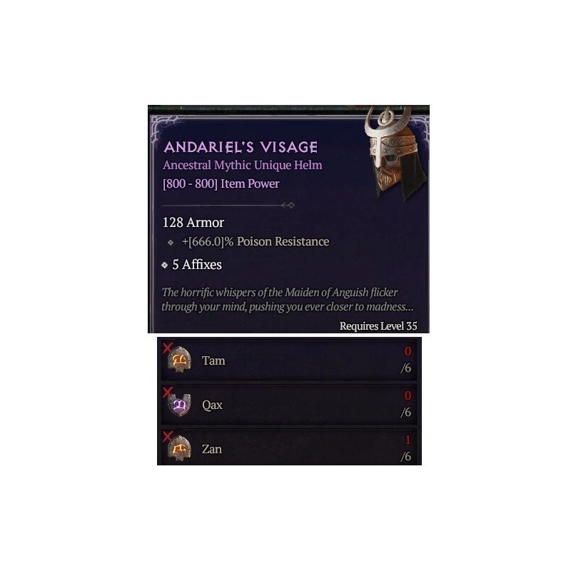 Diablo 4 S9 Andariel's Visage Mythic Unique Helm 6 Tam Qax Zan Rune Craft Set