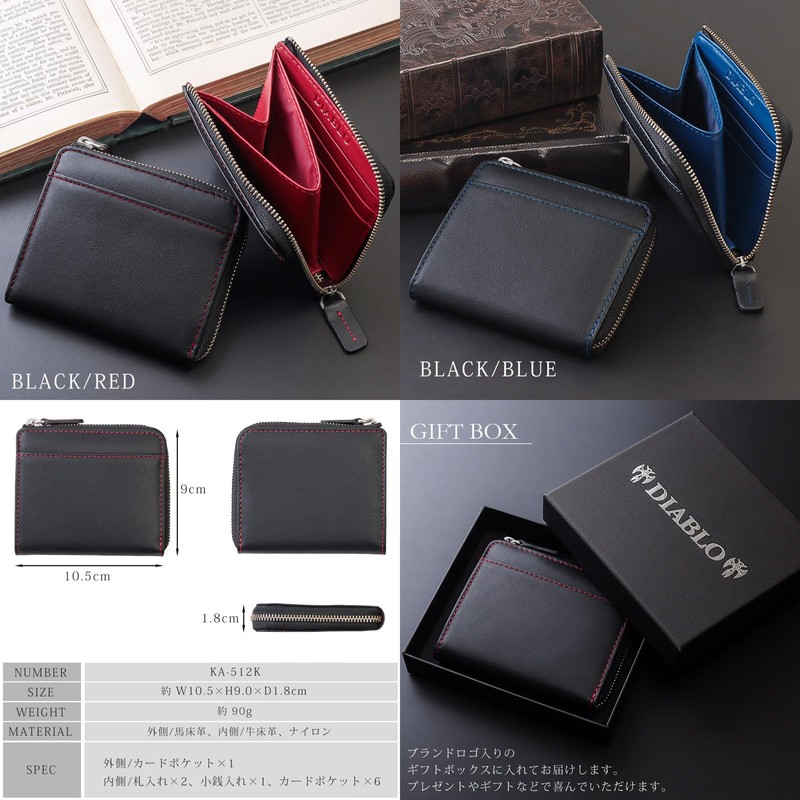 Diablo KA-512 Men's Wallet, Compact, Leather, Thin L-Shaped Zipper, Design Color, multicolor (black / red)