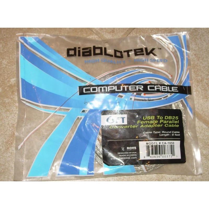 Diablotek Cable USB to DB25 Female Parallel Adapter Cable New in Package 6 Ft High Speed