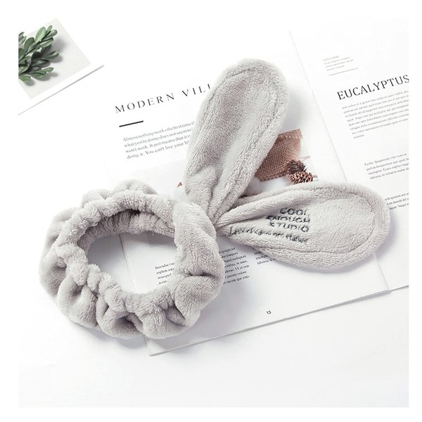 Diadema de pelo para lavar la cara, suave coral de forro polar con forma de conejo y orejas de conejo para maquillaje, 1 pieza (gris)