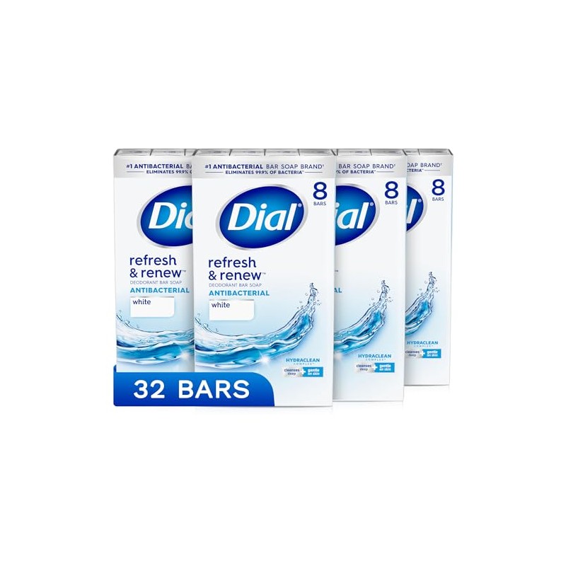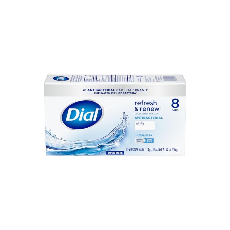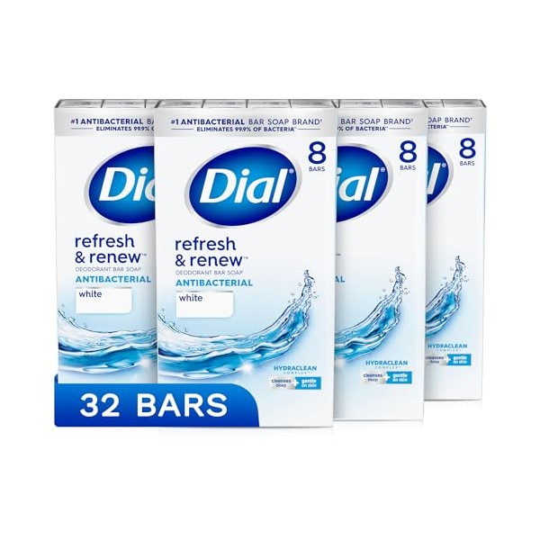 Refresh & Renew White Antibacterial Bar Soap. Revitalize yourself with a crisp uplifting clean that leaves you feeling fresh. Dial HYDRACLEAN Complex cleanses deep while being gentle on your skin, leaving it feeling soft & healthy. Dermatologist tested & approved under the Leaping Bunny cruelty free program. This package contains (32) four ounce bar soap.