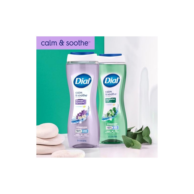 New from Dial! Calm & Soothe Lavender & Jasmine body wash. Unwind with the scent of Lavender & Jasmine and transport yourself to a calming place. Dial HYDRACLEAN Complex feels deeply cleansing while being gentle on your skin, leaving it feeling soft & healthy. Dermatologist tested & approved under the Leaping Bunny cruelty free program. This package contains fluid ounces of Dial body wash.