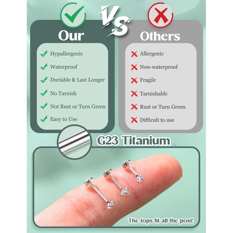 • Premium quality: made of G23 titanium, hypoallergenic and durable, nickel and lead free, waterproof. Well polished, smooth surface and comfortable to wear without sharp edge. Perfectly suitable for people with sensitive skin, our nose studs lip piercing undergo rigorous tests to ensure that they are nickel and lead free, with the safety of your skin paramount.