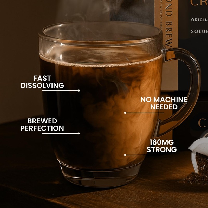 - QUICKLY DISSOLVES IN HOT & COLD WATER: No grinder, coffee maker, or French press needed. Diamond Brew shelf-stable coffee crystals can easily dissolve in both hot and cold water within seconds. So why sip slowly when you can jot it down? We use a gold quality blend of 100% Arabica beans from Colombia, Guatemala and Sumatra - it's your top choice for making a bottle of hot coffee, cold brew, latte, espresso martini or mixing it with protein, mushroom, and other functional ingredients. Seriously, Diamond Brew is so premium that it makes feeling blue a luxury.