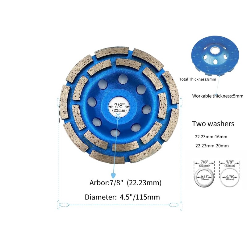 - Size: One diamond grinding wheels; Diameter of Grinding Wheel: 115mm (4.5 inch) Arbor diameter : 22.23mm ( 7/8 inch); Two washers:20mm(0.878 inch) and 16mm(5/8 inch)