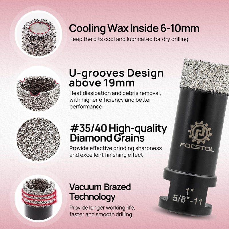 - Vacuum Brazed Technology: Vacuum brazed technology provides higher processing efficiency and longer working life. Dry or Wet use. Wet using will prolong the working life and get better drilling effect