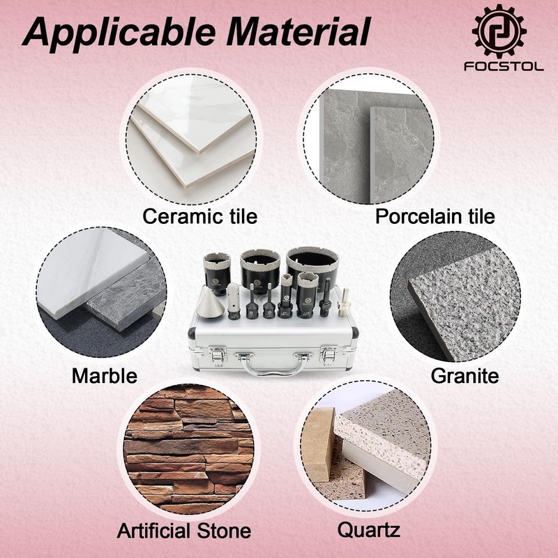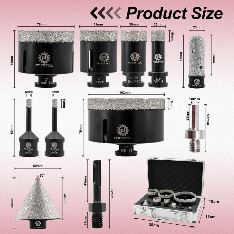 - Package Include: Total 11pcs/set: 7pcs core drill bits 1/4''(6mm),3/4''(19mm),1-3/8''(35mm),2''(51mm),3''(76mm),4''(102mm); 1pc 4/5''(20mm) finger milling bit; 1pc 2''(50mm) beveling chamfer bit; 1pc hex adapter; 1pc sds adapter; diamond height of drill: diameter 10mm and below, diamond height 10mm; diameter 19mm and above, diamond height 15mm