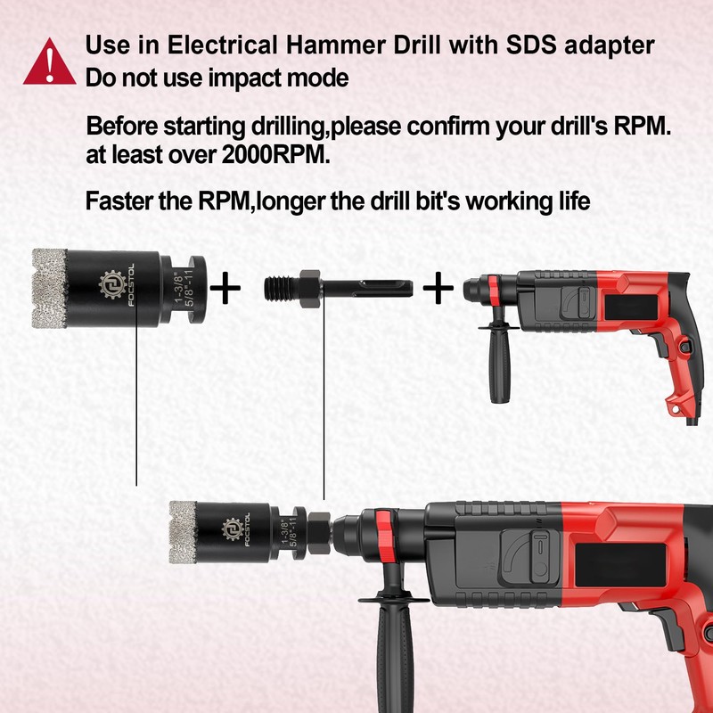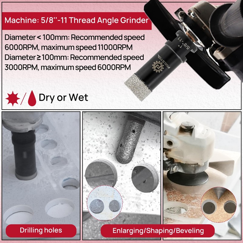 - Recommended Machine: The drill bits are usually suitable for Angle Grinder. Less than 100mm: Recommended speed 6000RPM, maximum speed 11000RPM. 100mm and above: Recommended speed 3000RPM, maximum speed 6000RPM. If you want to use electric drill or other machine, you can use SDS or other Adapter.