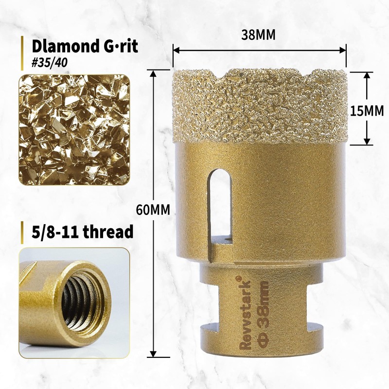 - Specifications: Diameter: 38 mm (1-1/2 inch), Diamond Height:15 mm, Total Length: 60 mm, Thread: 5/8-11, Diamond Grit: #35/40