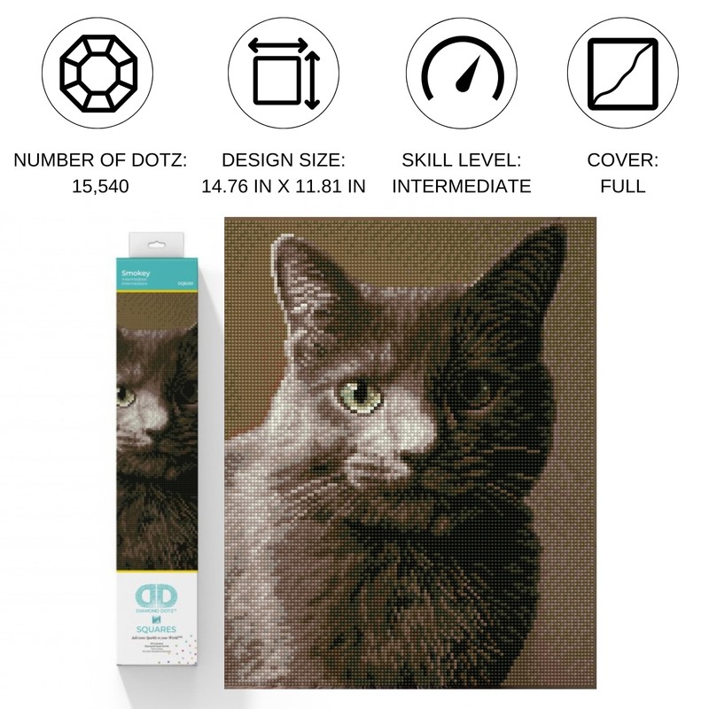 - Immerse yourself in the feline charm of our DIAMOND DOTZ Smokey. This Full Drill, Square Dotz cute diamond painting kit brings a captivating cat-themed artwork to life with stunning diamond-like facets.