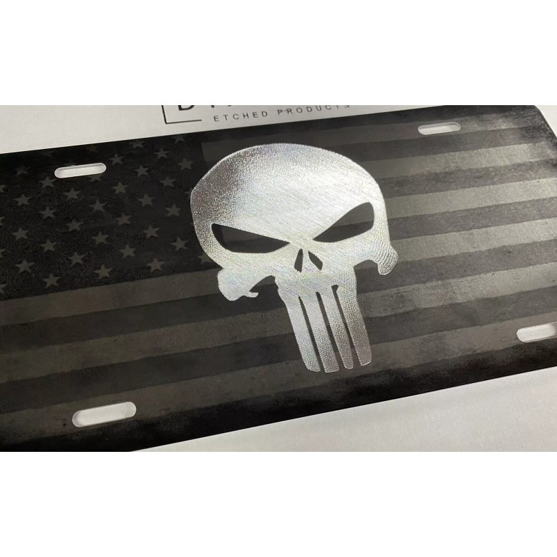 Diamond Etched Products Engraved Punisher Combo Laser US Flag & Diamond Etched Car Tag License Plate
