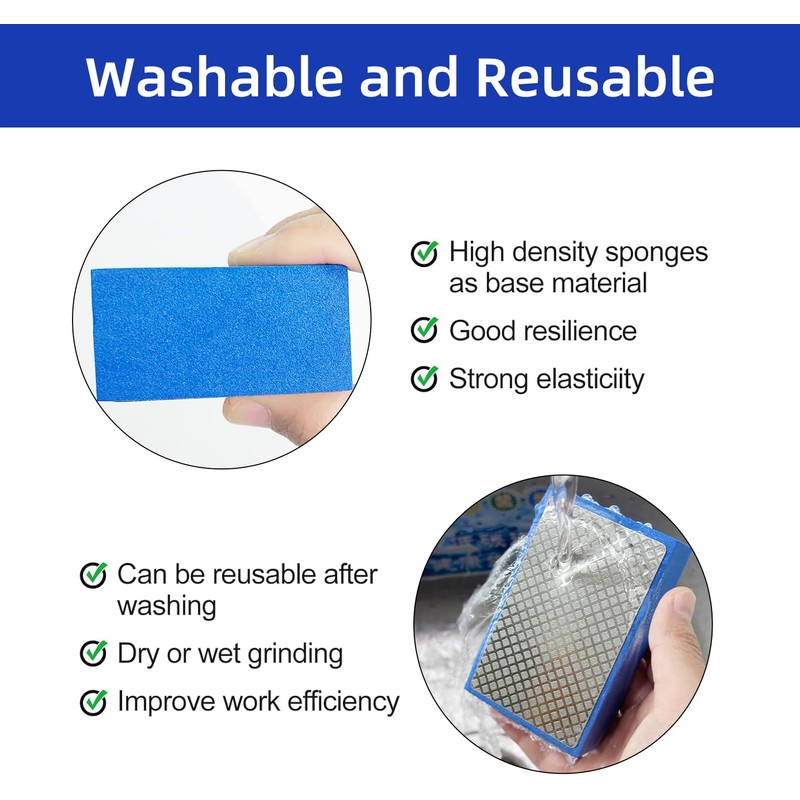 • 【Premium & Reusable】Professional polishing materials have the characteristics of wear and heat resistance. And our diamond hand polishing pads are composed of super abrasive diamond plating and high elastic sponge, which is wear-resistant, efficient, and reusable.