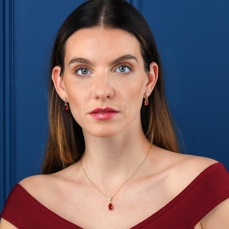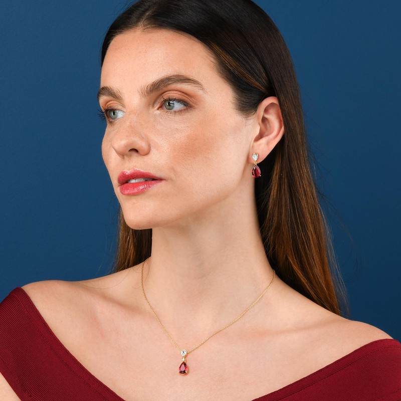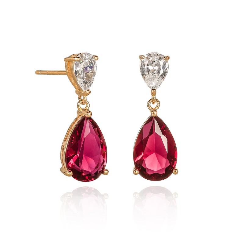 - Gold drop earrings for women and girls. Elegant gold plated earrings for women with pear-shaped ruby red and clear AAA Cubic Zirconia stones.