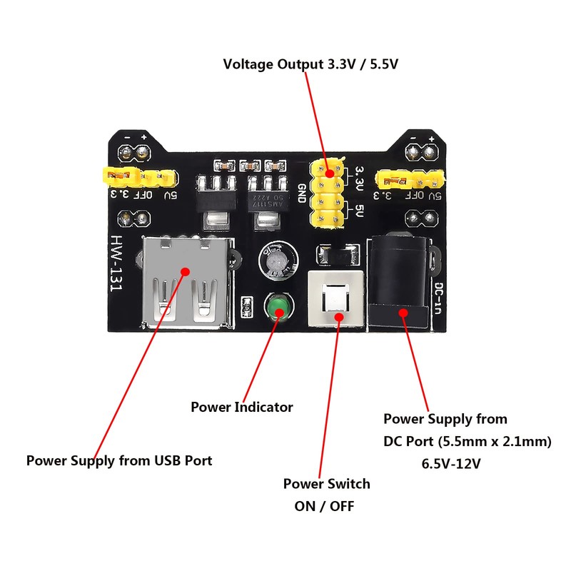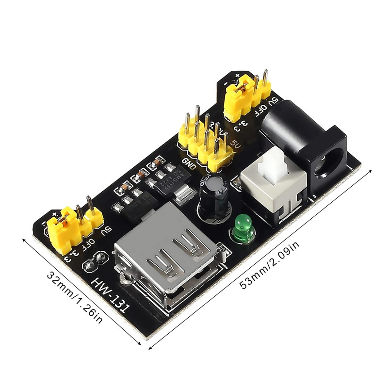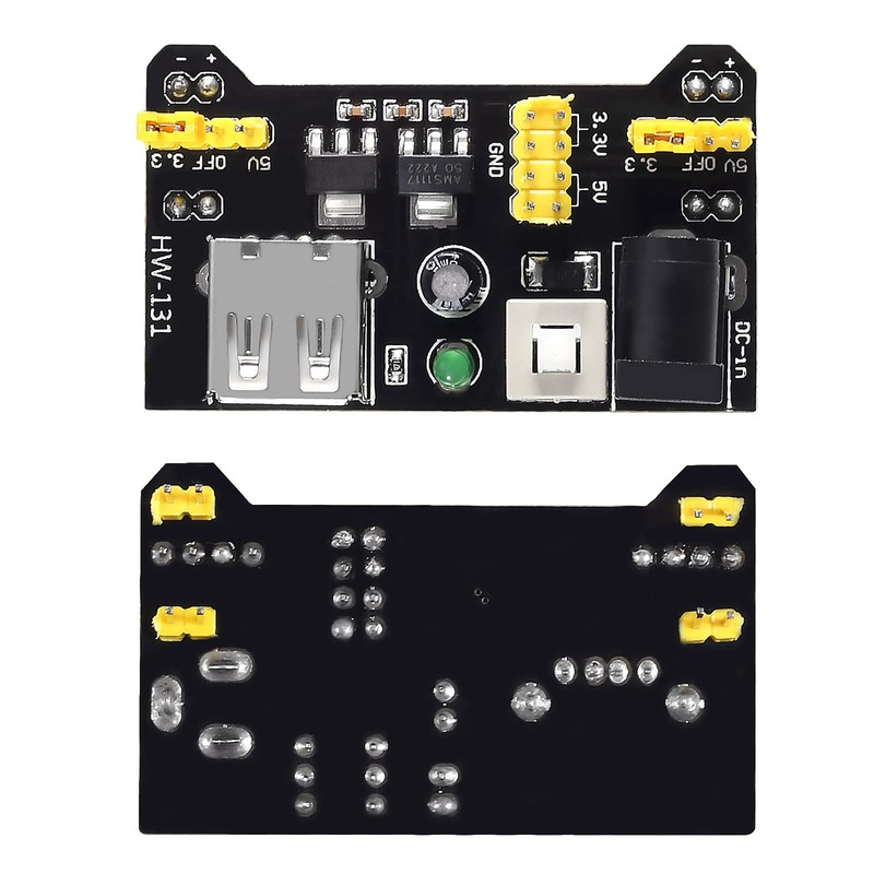 - Independent Control: Jumper Pins are Utilised for Selecting the Voltage Levels On Each Side of the Breadboard Power Rails. You Can Choose Between 5V, OFF, and 3.3V