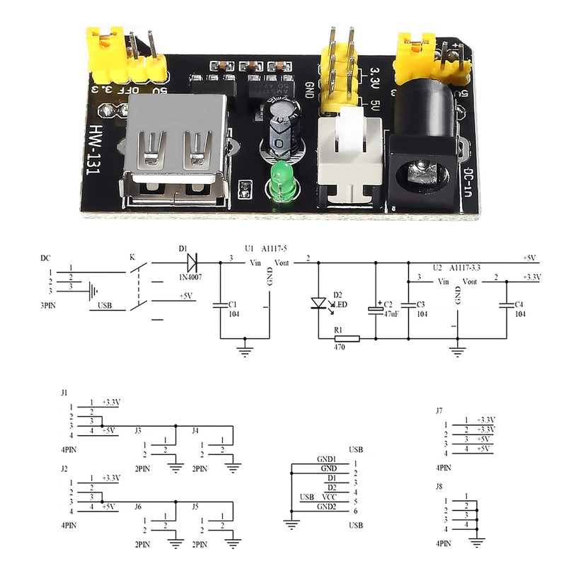 - Output Voltage: 3.3V / 5V; Input Voltage: 6.5-12V (DC) or USB Power Supply; Output Current: 700mA (Max)