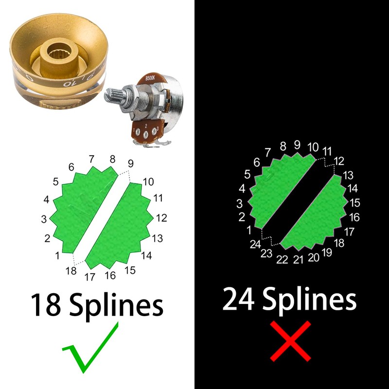 With a metric size of 18 coarse splines and a 6mm (15/64 inch) inner diameter, these knobs are ideal for most imported guitars, ensuring a secure fit and smooth performance. Please note, these knobs are not compatible with USA/Imperial pots, such as CTS, Fender, Dimarzio, or Burns.
