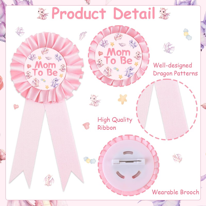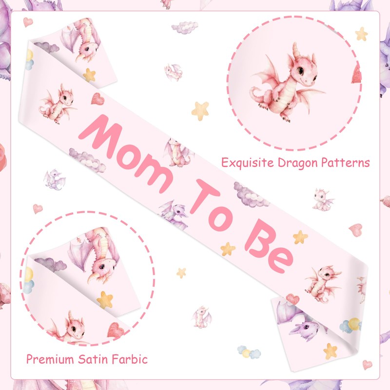 - You Will Receive: You will receive 1 dragon mom to be sash, 1 mom to be tinplate badge pin, 1dad to be pin and 1 pink flower wreath headband, which is a very diverse maternity set.