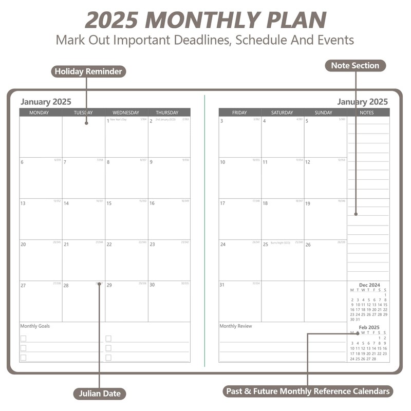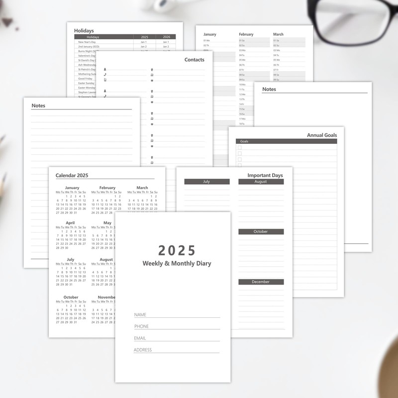 - Page contents: Important days plan / Monthly planner / Annual Goals page/ Holidays /Contacts /Blank page for notes.