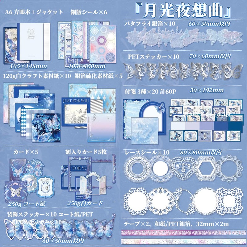 Product Contents: A6 notebook, poster cover, folding sticky notes x 10, washi tape x 2, sticky notes x 60, material paper x 15, frame cards x 5, PET stickers x 10, decoration stickers x 10, hot silver butterfly stickers x 10, washi stickers x 6, removable stickers x 5, deformation cards x 5, coated paper stickers x 6, lace stickers x 10
