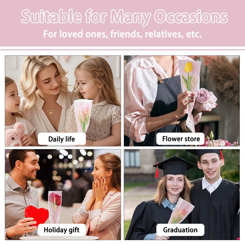 - 【Stylish Design】--The single rose sleeves features a retro triangular design, creating a unique and stylish look that instantly enhances the overall style and beauty of a bouquet. The included pink ribbon is a soft, warm color that complements the packaging bag. Simply tie it into an elegant and romantic bow, adding a sweet and warm touch to any bouquet, making it even more appealing
