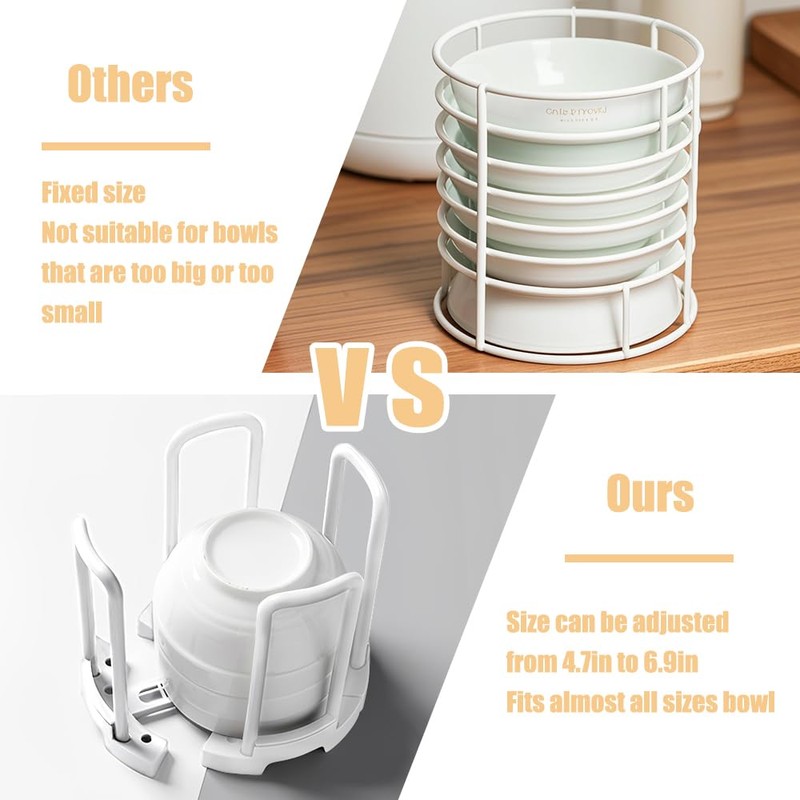 • 【Removable Design】--The bowl organizer for kitchen cabinets adopts a detachable design, which is convenient for storage when not in use and does not take up too much space. This design not only saves kitchen space, but also makes more convenient when cleaning. You can easily disassemble the plastic bowl rack, wipe it with a damp cloth or dry it with a towel to keep it clean and tidy.