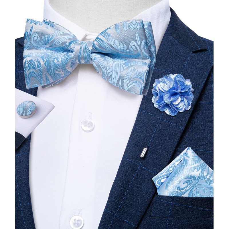- 【Package Includes】Silk Mens Light Blue Pre-tied Bow Tie + Pocket Square + Cufflinks + Lapel Pin + Box, great gift for Valentine's Day, Anniversary, Christmas, Halloween, Thanksgiving and Father's Day