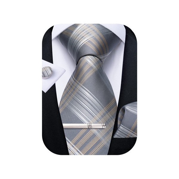 DiBanGu Mens Fromal Necktie Gray Plaid Tie and Pocket Square Tie Clip Set Cufflinks
