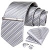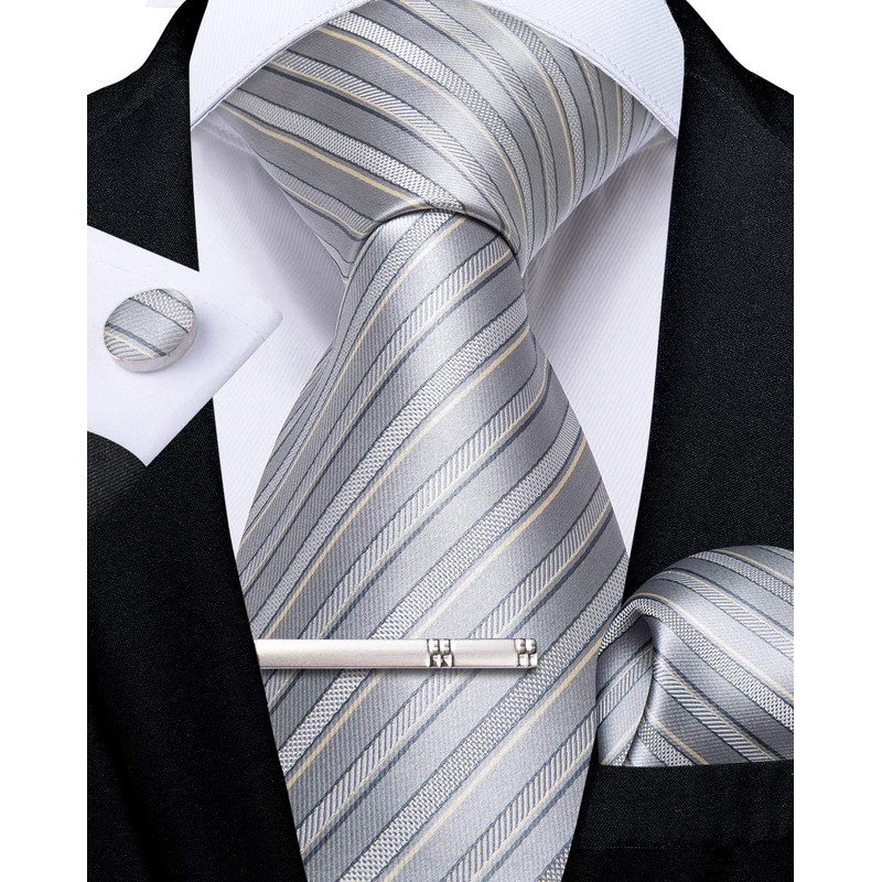 DiBanGu Necktie, Striped Necktie, Handkerchief, Cufflinks, Tie Pin Set, Wedding, Business, School Entrance Ceremony, Graduation, Year End Party, silver1