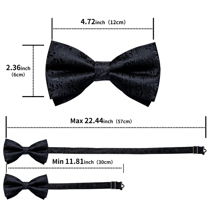- 【Classic Size】Bow tie size: 4.7 inch * 2.4 inch,Adjustable Neck Size: 11.81 inch - 22.44 inch,Pocket Square size: 9 x 9 inches,Cufflink Diameter:0.55 inches(1.4cm).Exquisite men's satin bowtie set for a variety of dress shirts and suit tuxedo.