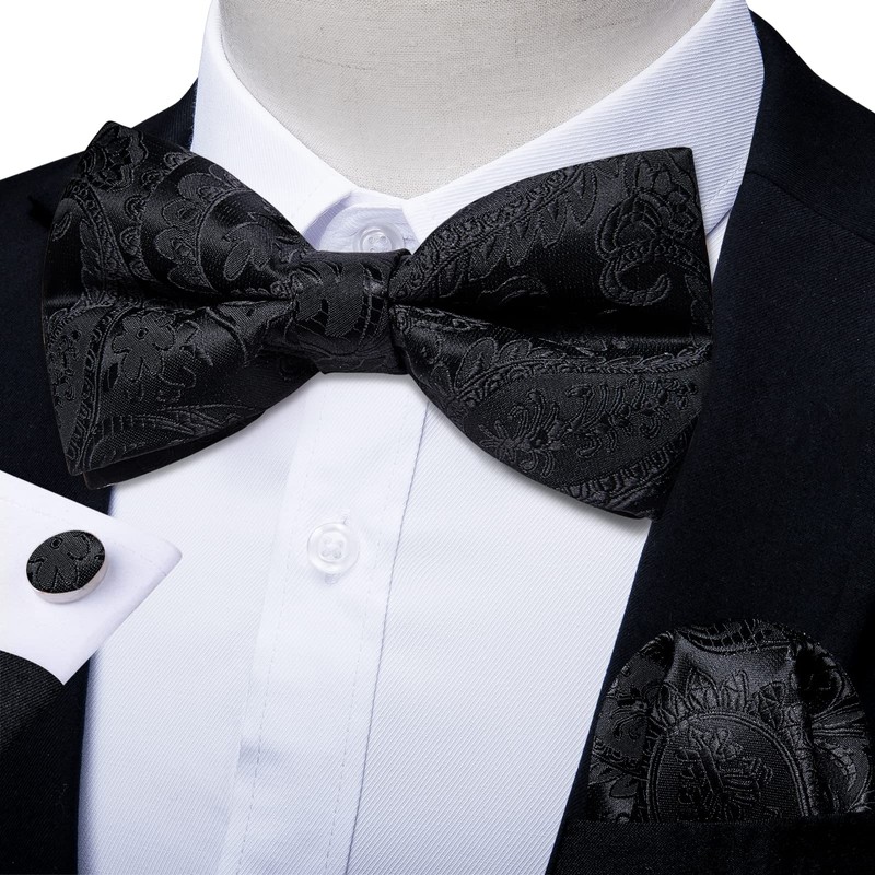 - 【Package Includes】Black Pre-tied Bowtie + Handkerchief + Cufflinks + Gift Box. This bowtie set is the best gift for father, son, husband, friends on Father's Day, Christmas, Valentine's Day, New Year and so on