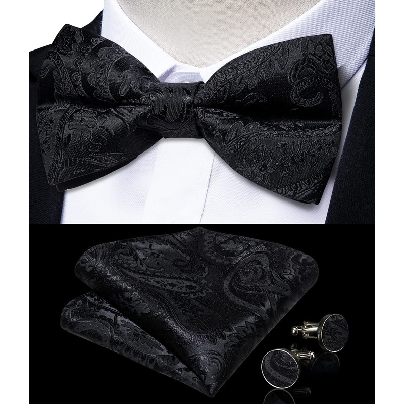 DiBanGu Pre-Tied Silk Bow Tie Set for Men Black Paisley Bowtie and Pocket Square Cufflinks for Business Party