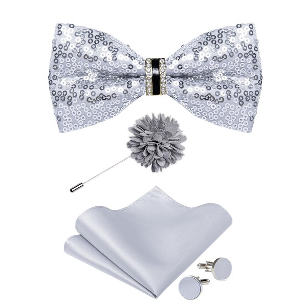 - 【Sequin Bowtie Set】 Grey Sequin Bowtie with Shiny Ring + Lapel Pin Brooch + Pocket Square + Cufflinks. It's a surprise gift for father, husband, son, boyfriend, groomsmen,and all loved ones on Father's Day,Christmas Day,Valentine's Day,Thanksgiving Day,Anniversary,birthday ect