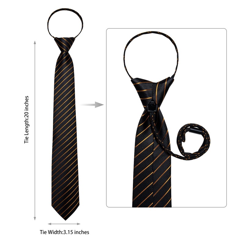 DiBanGu Silk Zipper Ties for Men,Paisley Solid Plaid Pre-tied Tie and Pocket Square Cufflinks Set Formal Adjustable Necktie, Black and Gold Stripe, One Size