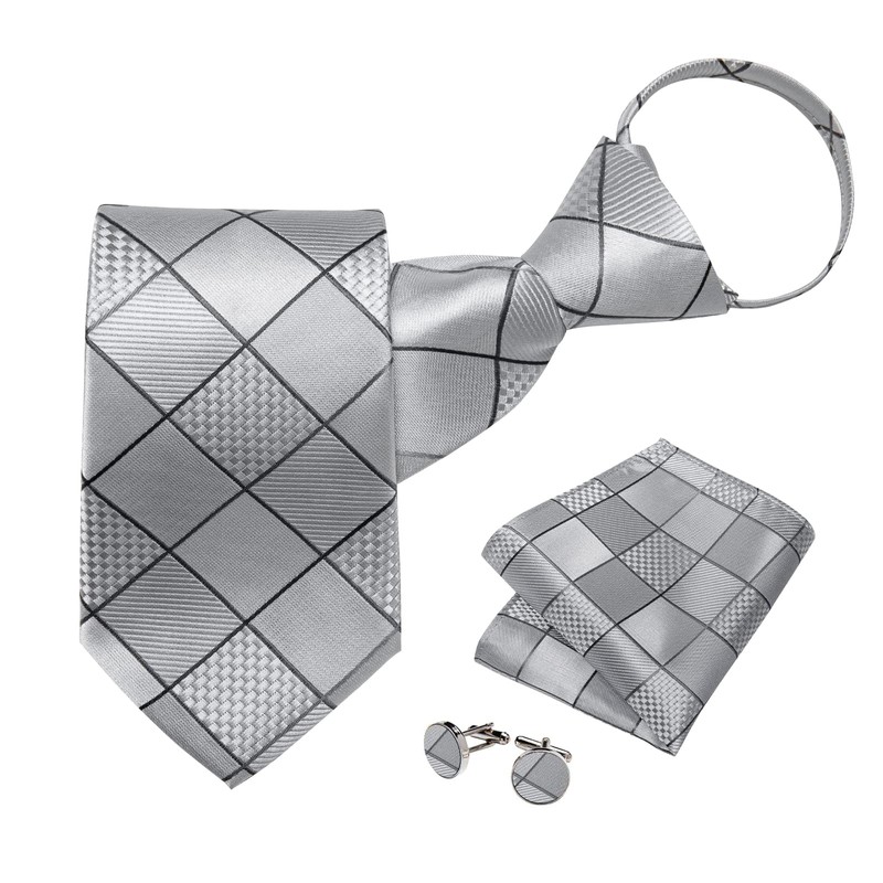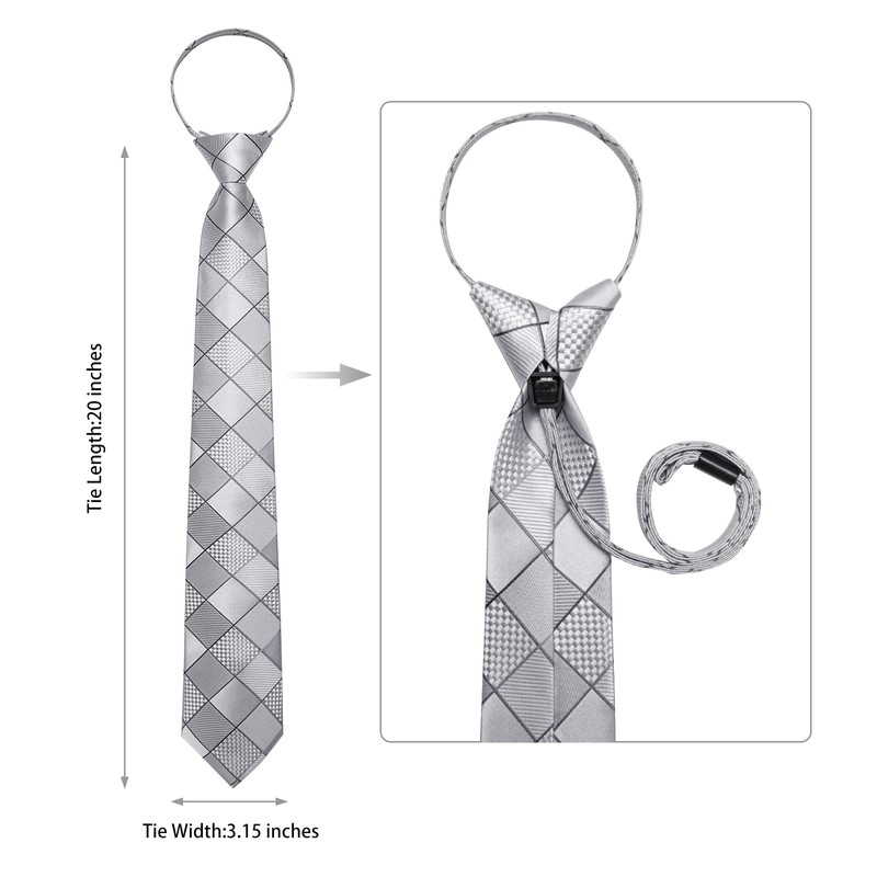 DiBanGu Silk Zipper Ties for Men,Paisley Solid Plaid Pre-tied Tie and Pocket Square Cufflinks Set Formal Adjustable Necktie, Silver