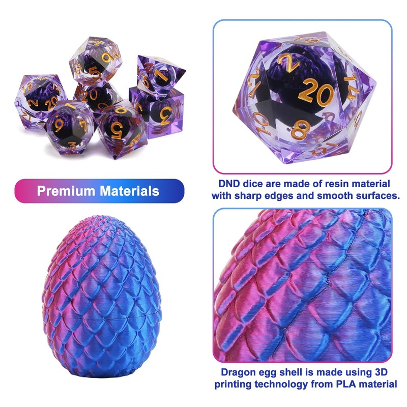 - Premium Materials: DND dice are made of resin material with sharp edges and smooth surfaces. Dragon egg shell is made using 3D printing technology from PLA material