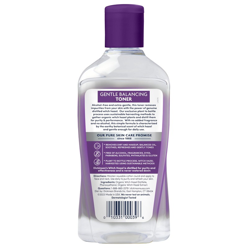 The pure power of Dickinson's Witch Hazel skincare is our first ingredient, 100% natural distilled witch hazel. Dickinson's alcohol free Gentle balancing Toner gives you pure beauty with 99% natural distilled witch hazel to gently cleanse and balance skin in one multi-benefit step to reveal pure you Distilled for pure performance, It removes excess oil, dirt makeup residue without overdrying. Our exclusive formula with no alcohol, fragrances, soaps, dyes, sulfates, phthalates, parabens or gluten, is gentle enough to use every day and perfect for expectant mothers and sensitive skin